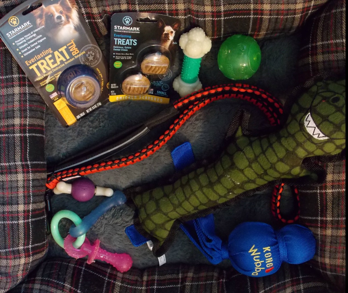 Starmark Everlasting Treat Ball Dog Toy – Small/chicken flavor (upper left corner) – I have a larger version of this treat toy shaped like a tire for my dogs back home that they absolutely enjoy. What I love most is that it takes them a while to get the treat out of the center. However, I can’t say I’m that impressed with this smaller one. While the larger ones are made out of stronger material, this smaller version was not as tough and my puppy practically ate right through it to get to his treat. If you get this, make sure it’s tougher material!
