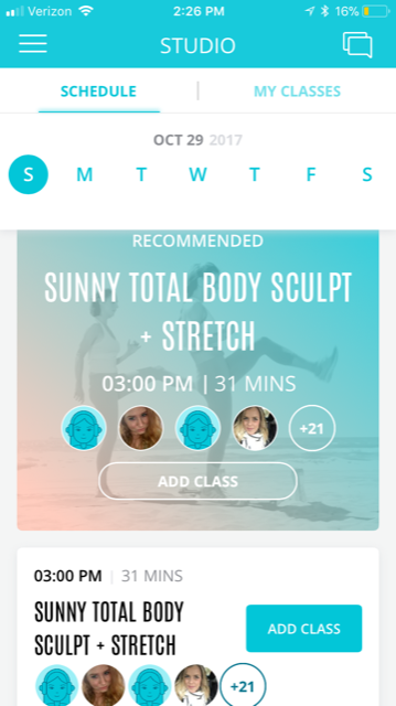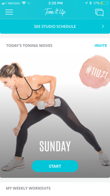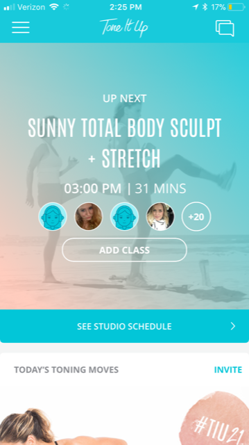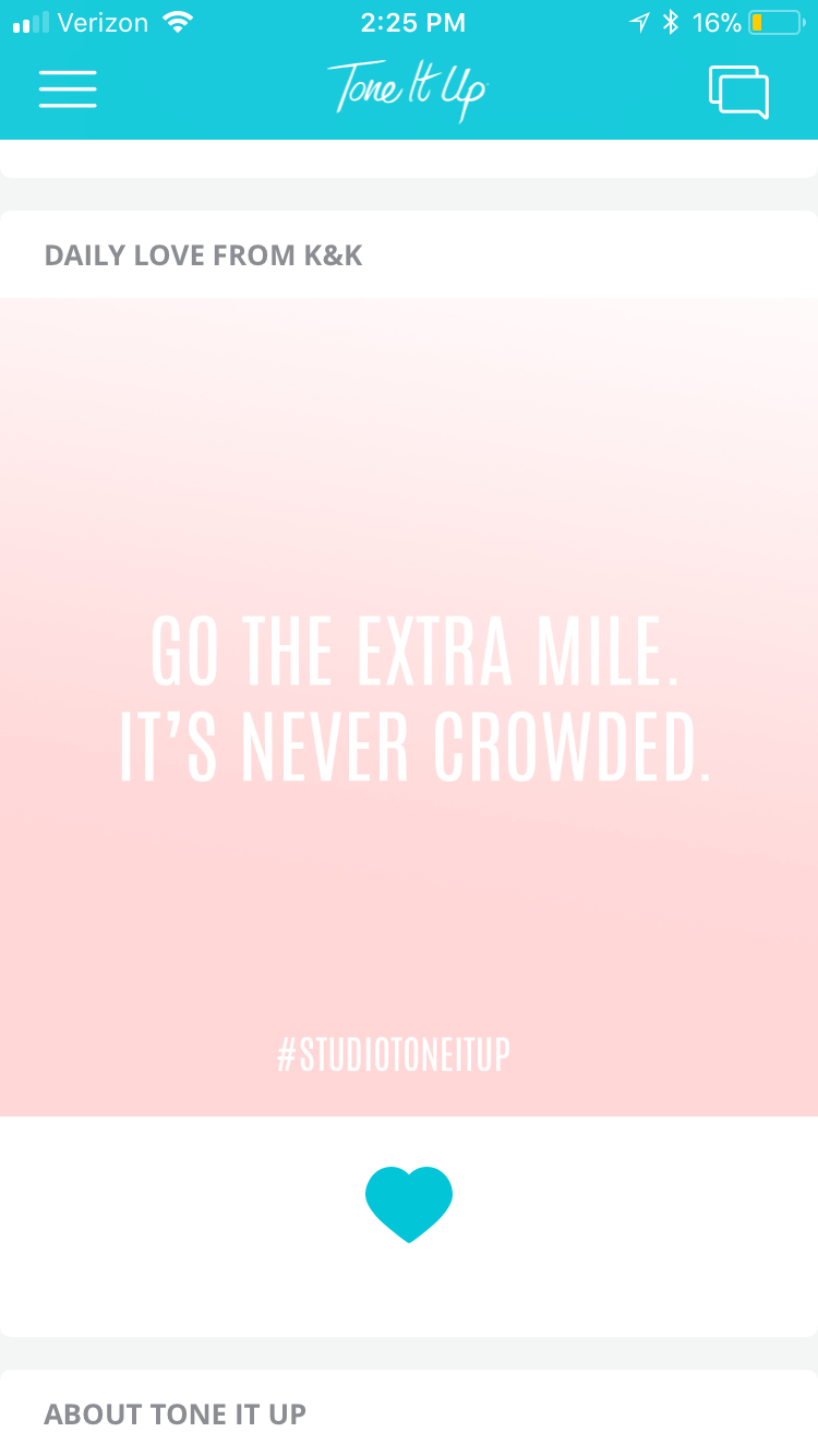So I thought, what the heck, let’s do the 7 day free trial and if I’m not completely sold I won’t get it. Of course I was sold!!! I have to tip my hat to Tone It Up because this app literally has everything. On the home page of the app you see the next available studio class, your daily toning moves, and daily inspiration from Karena & Katrina!
