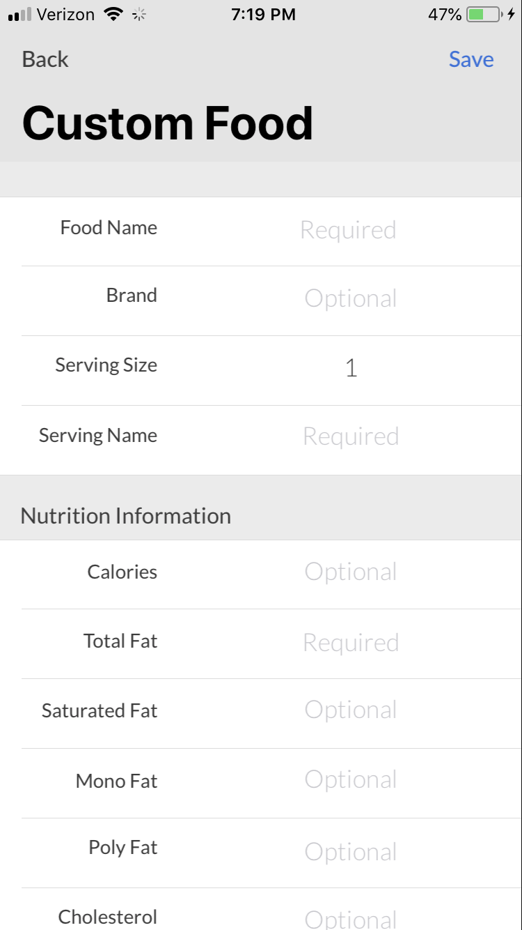 To manually enter a food, select the Custom & Favs button and then hit the plus sign in the upper right hand corner. From there you will manually enter all of the information found on the nutrition label of your food item. Now, a lot of items like produce do not have this information. I usually search the item in Google and find out the value.