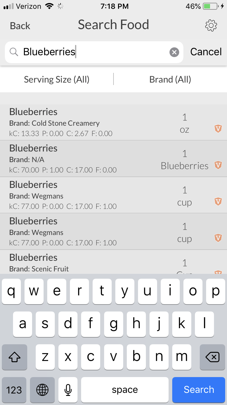 If you decide that you want to search for something, simply start typing the food item in the search bar. This will then bring up a ton of options. You can then filter by serving size or brand. If what you are looking for doesn’t come up, it’s easiest to manually enter it. Don’t think that you have to find the exact brand of certain things though. You will start to see what a certain serving size of a particular food item has (carbs/protein/fat) and so usually the brand doesn’t matter if you see a few options that are identical.