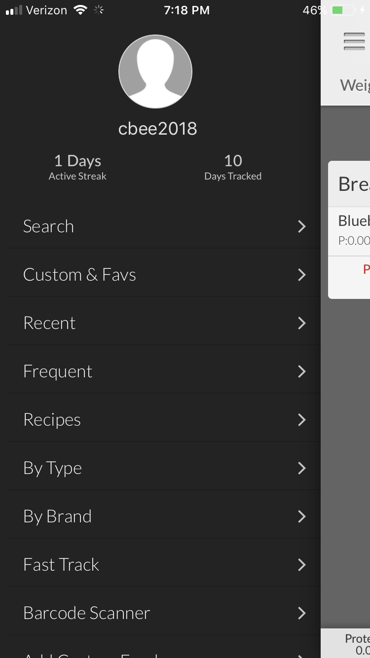 Once you know what you want to eat, hit the track now button. Once you tap that it will take you to your sidebar when you can search for foods, manually enter foods that might not be in their database (which can be a lot), search your most recent foods, and more.
